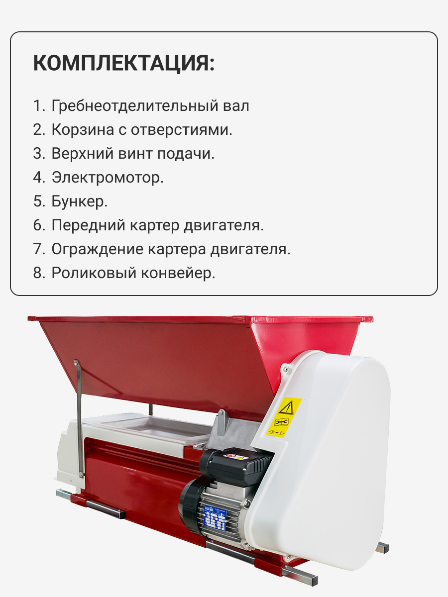 Виноград скользит по стенкам бункера (5) на пару роликов (8), где производится его дробление. После того, как он раздроблен, подается к гребнеотделительному валу (1), где отделяются стебли. Далее виноград поступает в корзину с отверстиями (2) и попадает в предварительно подставленную под машину емкость.
